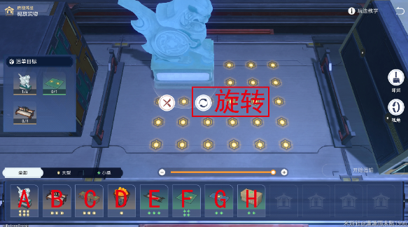 答案中字母为下方货物从左至右依次的字母编号,“旋转”为点按装载相应货物后,在场地中单击该货物显示出的右下方按钮。