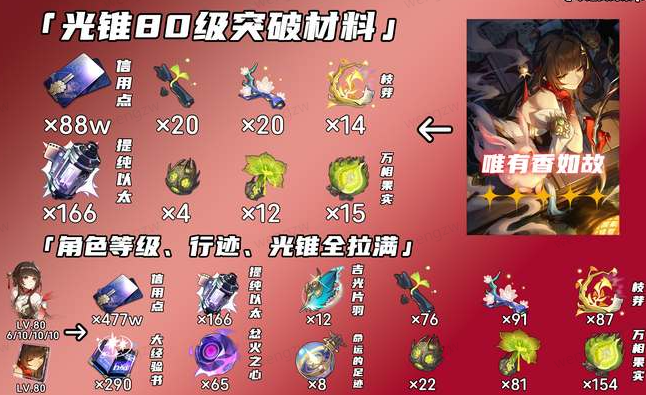 3、灵砂的专属光锥【唯有香如故】,其突破养成材料如下图所示: