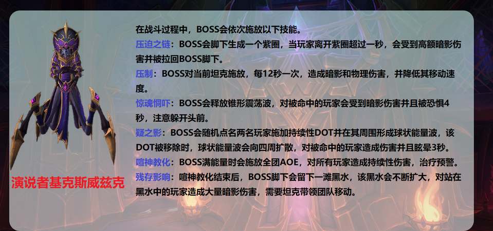 BOSS的技能对玩家造成暗影伤害的同时会留下一片残存影响,需要注意远离。