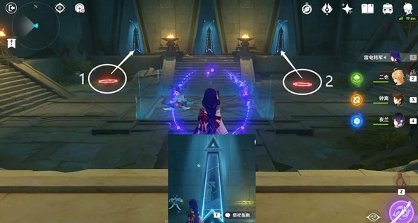 打开开关1号,旋转对应的方碑到图中图案并且发光,之后关闭开关1,打开开关2,也是旋转对应方碑到图中图案并且发光,等待中间石碑自动旋转并发光。